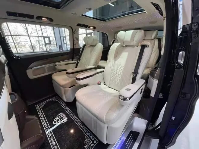 奔驰V260商务车前脸鹰眼大灯。3430mm轴距带来超大空间,保证内部巨大空间同时又能拥有。1034升李舱空间,加长版可达1410升,装得下一家人。也装得下一家人的欢乐,让所有心头之爱,都能安放。如果非要找一辆车来诠释 MPV 那么我选择奔驰V260!